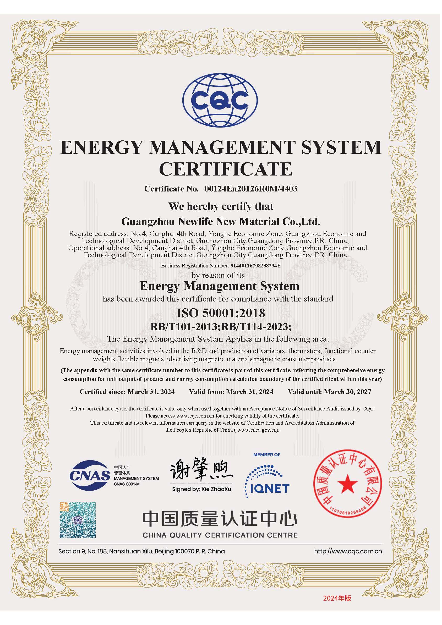 Guangzhou Newlife New Materials Co., Ltd. (NEWLIFE) earned the Energy Management System Certification in March 2024. The certification covers energy management in R&D and production of varistors, thermistors, powder metallurgy, flexible magnets, magnetic advertising materials, and consumer products.